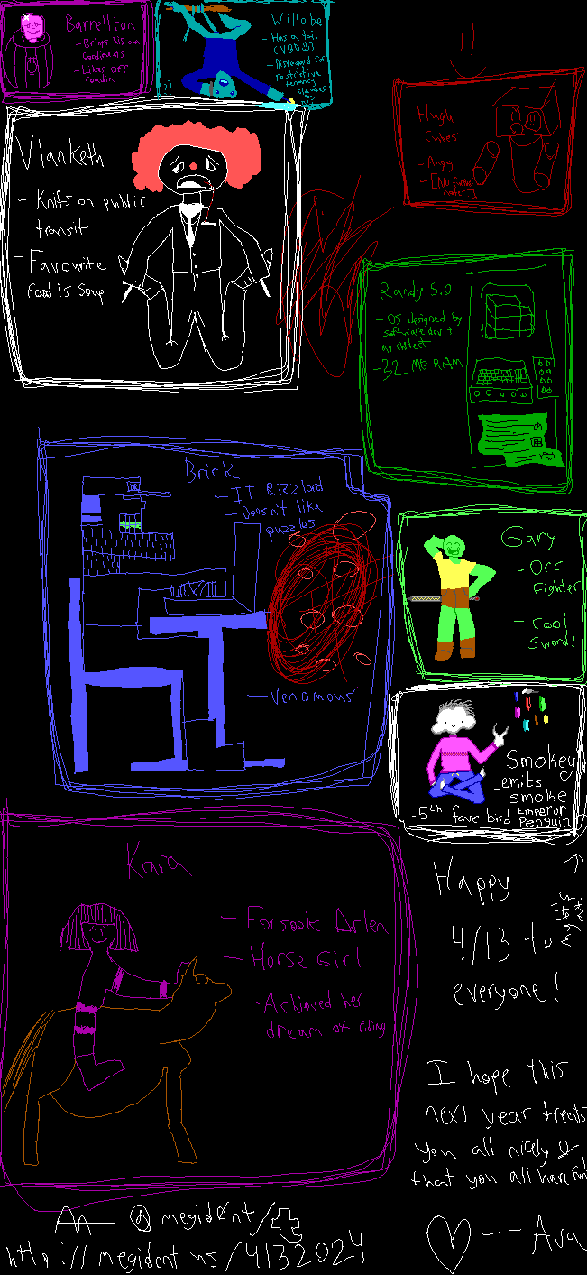 | Sat, Apr 13, 2024 | 07:00:25 PM CDT | Allan | Art | Here: | Available | Art stream! [Link] |